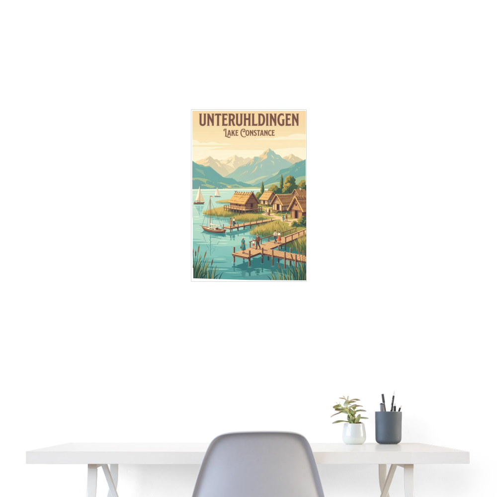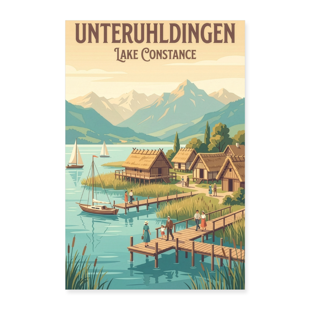 Dieses Premium-Reiseposter 40 x 60 cm zeigt Unteruhldingen mit den weltberühmten Pfahlbauten, dem ruhigen Bodensee und der Alpenkulisse. Die Verbindung aus Geschichte, Natur und Wasser macht dieses Motiv zu einem besonders wertigen Sammlerstück für Bodensee-Liebhaber.